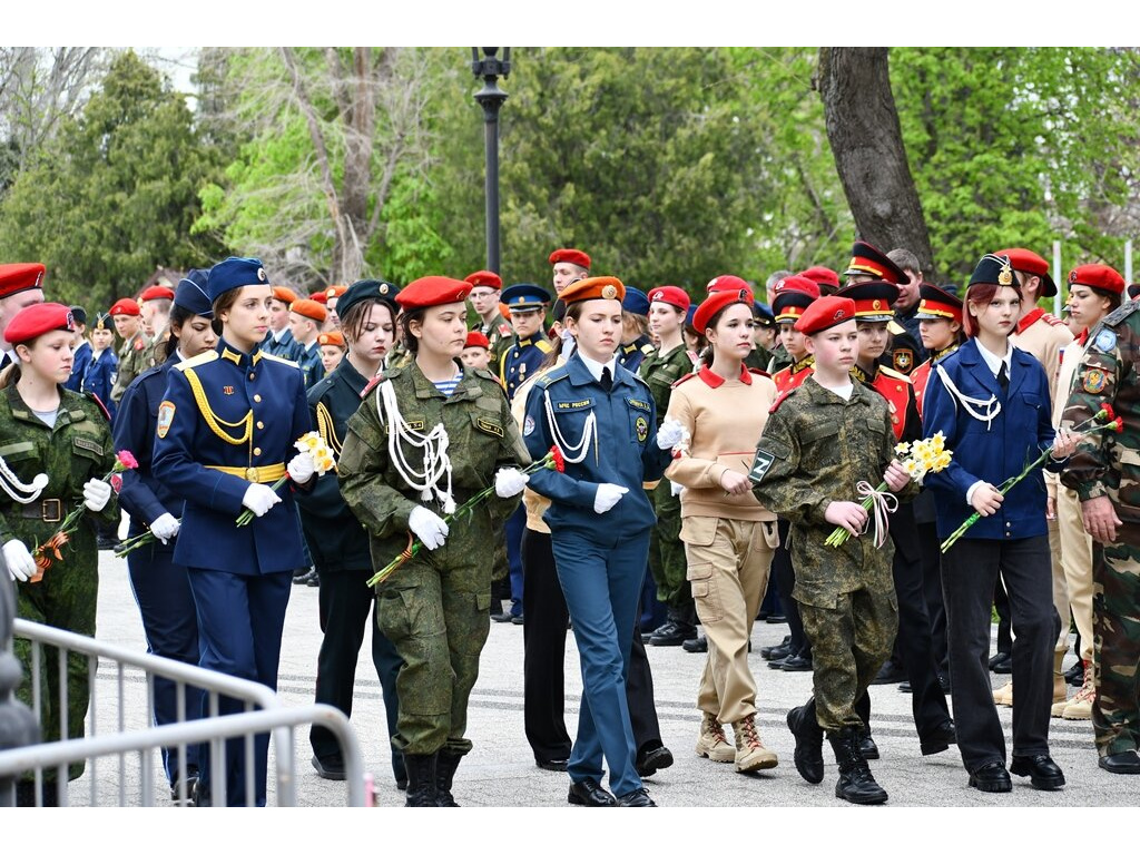 Юнармейцы школ № 1, 2, 3, 4, 5, 6, 9, 10, 11, 12, 13, 15, 17, 19, АНО ПО «Феодосийская АШ КРОО ДОСААФ» и воспитанники Казачьей общественной организации «Школа Джур» прошли торжественным маршем, которым руководил член муниципального штаба Почетного караула «Вахта памяти поколений – Пост № 1», полковник запаса, преподаватель-организатор ОБЖ Бабич Александр Витальевич.